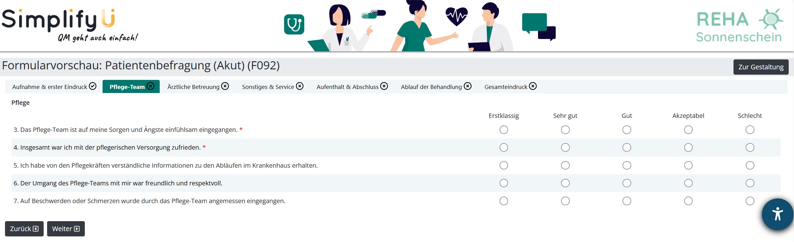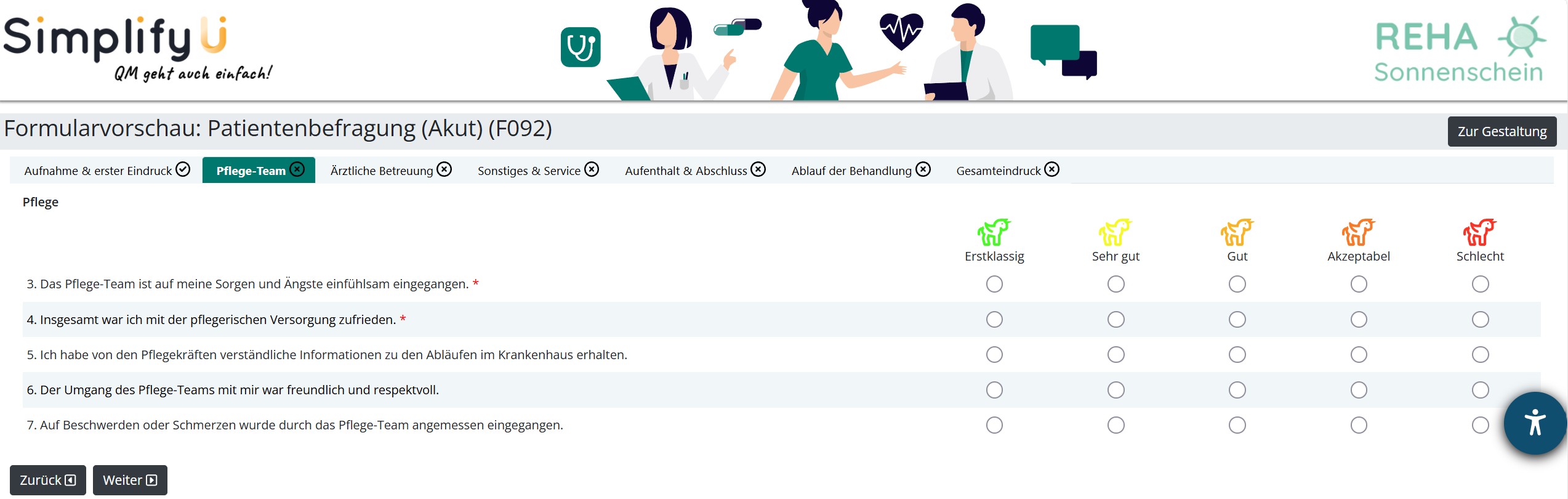 Matrixfragen sind ideal, wenn Sie mehrere inhaltlich zusammengehörige Fragen mit denselben Antwortoptionen platzsparend bündeln möchten, zum Beispiel je Bereich, Station oder Themenblock. Damit bleiben Befragungen übersichtlich und lassen sich für Teilnehmende schneller ausfüllen.