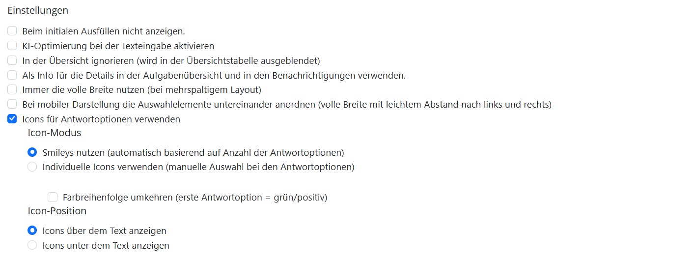 Wenn Sie mehr Gestaltungsfreiheit wünschen, können Sie statt Smileys auch eigene Icons verwenden. Für jede einzelne Antwortoption lässt sich ein beliebiges Icon auswählen und zusätzlich eine individuelle Farbe definieren. Das bedeutet: Sie sind nicht auf ein einheitliches Symbolschema festgelegt, sondern können je Antwortoption unterschiedliche Icons und Farben nutzen, passend zu Ihrem Fragebogen-Design oder zur gewünschten Wirkung in der Auswertung.