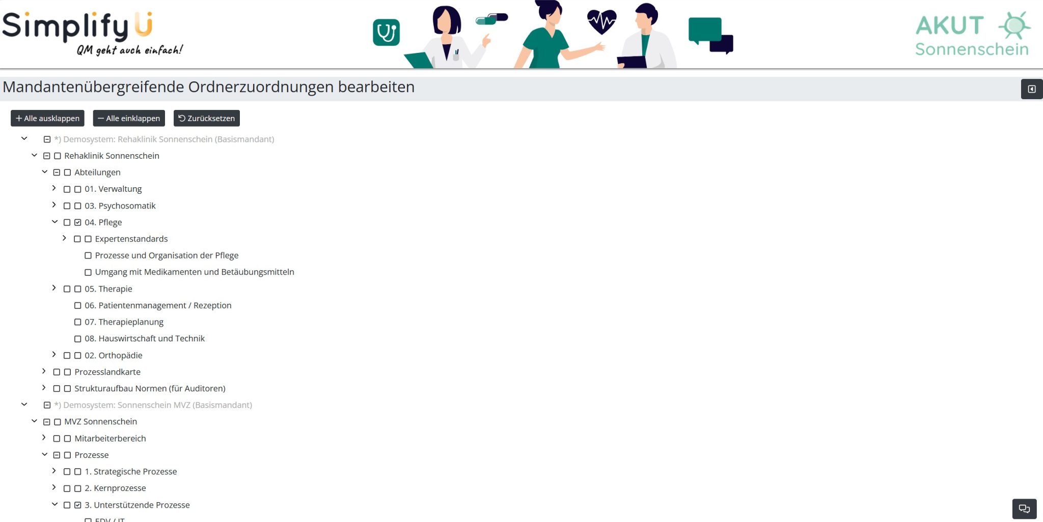 Zweitens können Dokumente aus einem übergreifend geteilten Ordner im eigenen Einrichtungsmandanten zusätzlich weiteren Ordnern zugewiesen werden. Damit bleibt die zentrale Struktur erhalten, und gleichzeitig können Einrichtungen die Inhalte passgenau in ihre eigenen Ablagen einordnen, ohne das zentrale Dokument zu duplizieren.