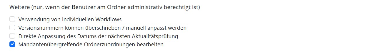 Drittens wird die Mandanten-Zuordnung einzelner Dokumente flexibler: Diese Aufgabe ist künftig nicht mehr ausschließlich QM-Admins vorbehalten. In den Rollenanpassungen kann die Berechtigung hierfür optional auch für die Rolle „Dokumentation – Verantwortlicher“ aktiviert oder deaktiviert werden. Wenn ein Benutzer im Zentralmandanten für einen Ordner verantwortlich ist und im Zielmandanten ebenfalls als Verantwortlicher am jeweiligen Einrichtungsordner hinterlegt wurde, kann er einzelne Dokumente gezielt in diese Ordner zuweisen. Dabei gilt weiterhin: Aktionen sind ausschließlich für Ordner möglich, für die der Benutzer in Ursprung und Ziel als Verantwortlicher eingetragen ist.